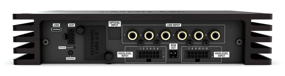Kaj storiti, če je vozilo že serijsko opremljeno z izboljšanim avdio sistemom, ki lahko vključuje tudi večkanalni ojačevalec? V večini primerov zamenjava takšnega ojačevalca ni možna; za nadgradnjo pride v poštev le ojačevalec, ki ima na voljo enako število High-level vhodov. V EIGHT ULTIMATE je DSP ojačevalec, ki nudi kar 12 takšnih vhodov, poleg tega pa še SPDIF optični vhod ter možnosti razširitve z dodatnimi HEC moduli (npr. HD Bluetooth). Vgrajen 14-kanalni DSP procesor skrbi za natančno nastavitev vsakega od svojih izhodov: 8 močnostnih kanalov za priklop zvočnikov + 6 RCA predizhodov za priklop dodatnih ojačevalcev.