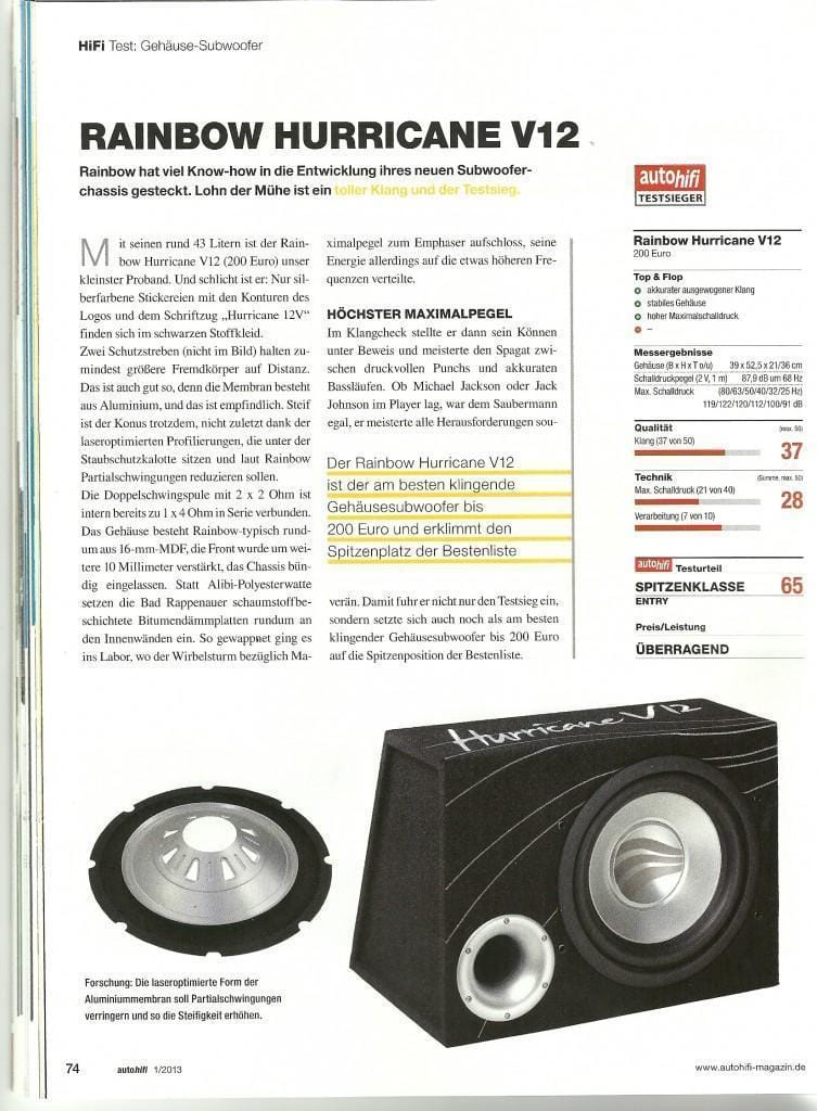 Subwoofer v škatli Rainbow Hurricane V10 je odličen dodatek vsakršnemu avdio sistemu v vozilu, kar potrjujejo tudi zmage na primerjalnih testih avdio revij v tujini (Price advice, Award Winner…).