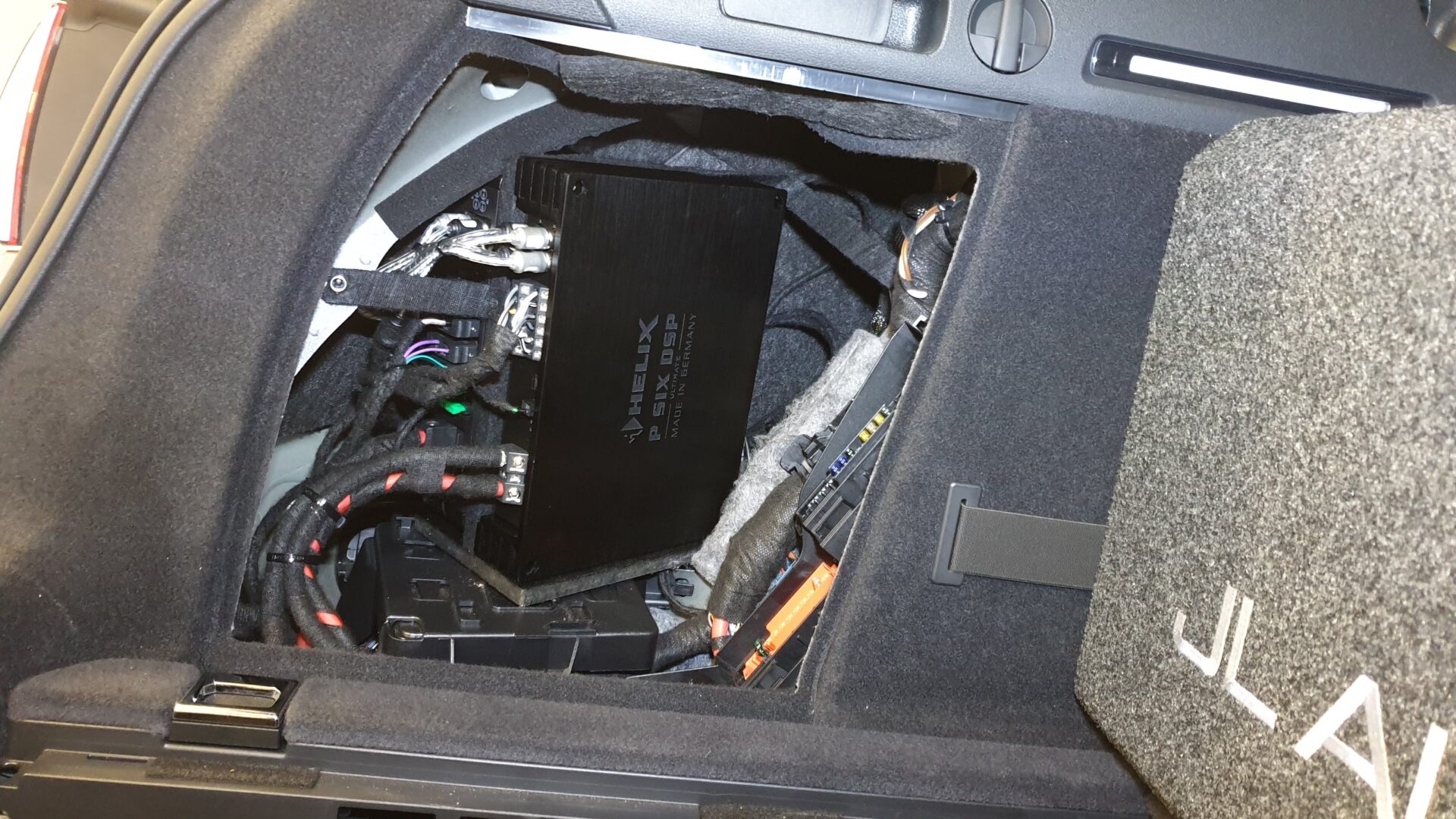 Vgradili smo nizkotonec JL Audio 10W6v3, ki je v posebnem ohišju, prilagojenem za najboljši možni bas. V levem boku vozila smo diskretno vgradili 6-kanalni DSP ojačevalec Helix P SIX DSP ULTIMATE, 4-kanalni Alpine PDX-F6 ojačevalec. Mono ojačevalec Helix P ONE, ki poganja nizkotonca in zagotavlja izjemen zvok brez popačenj je vgrajen v dnu prtljažnega prostora.