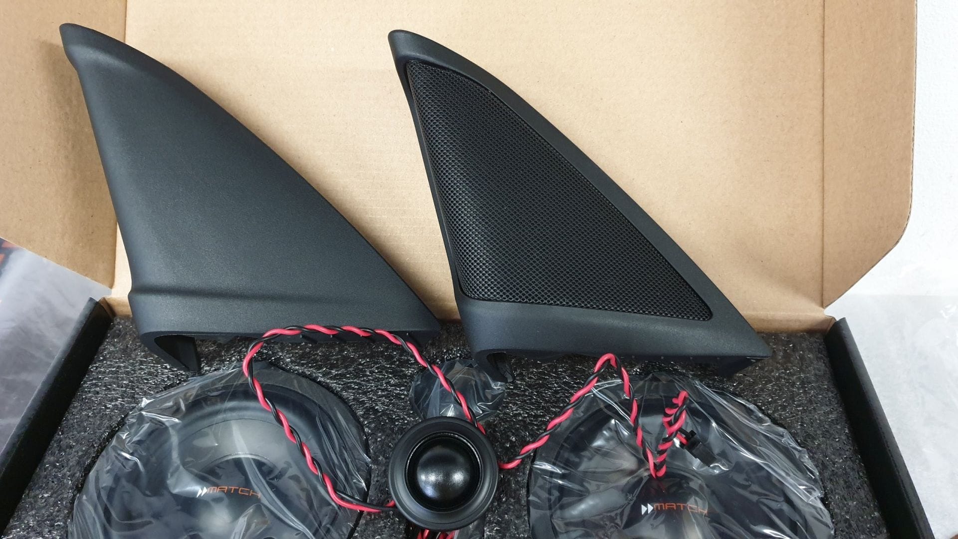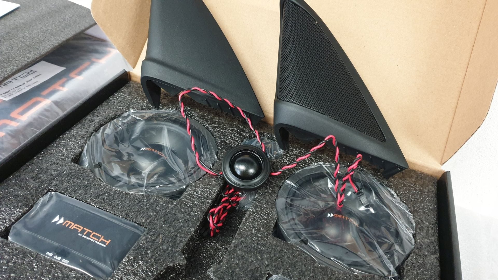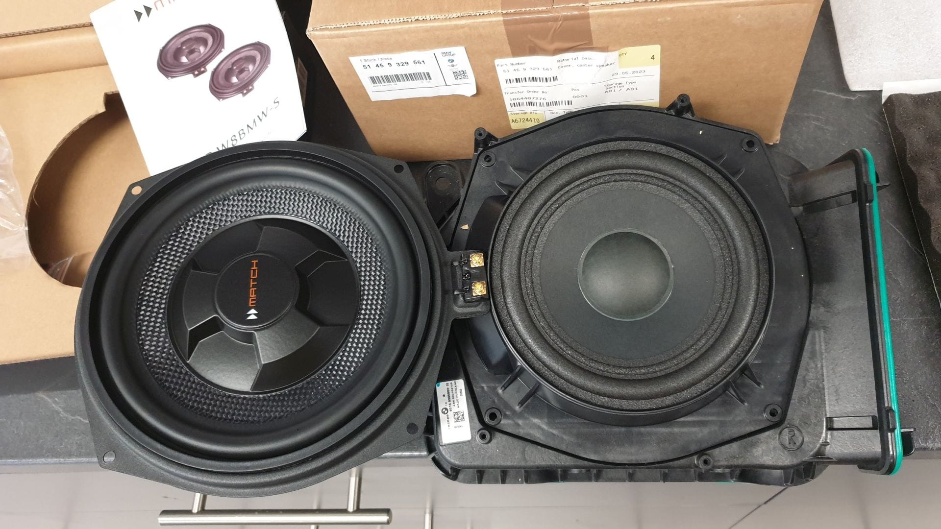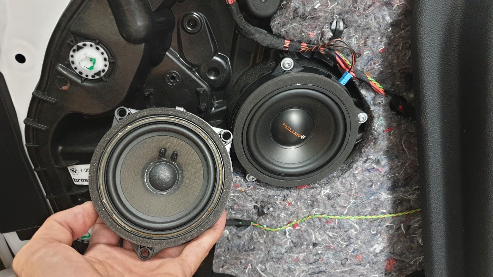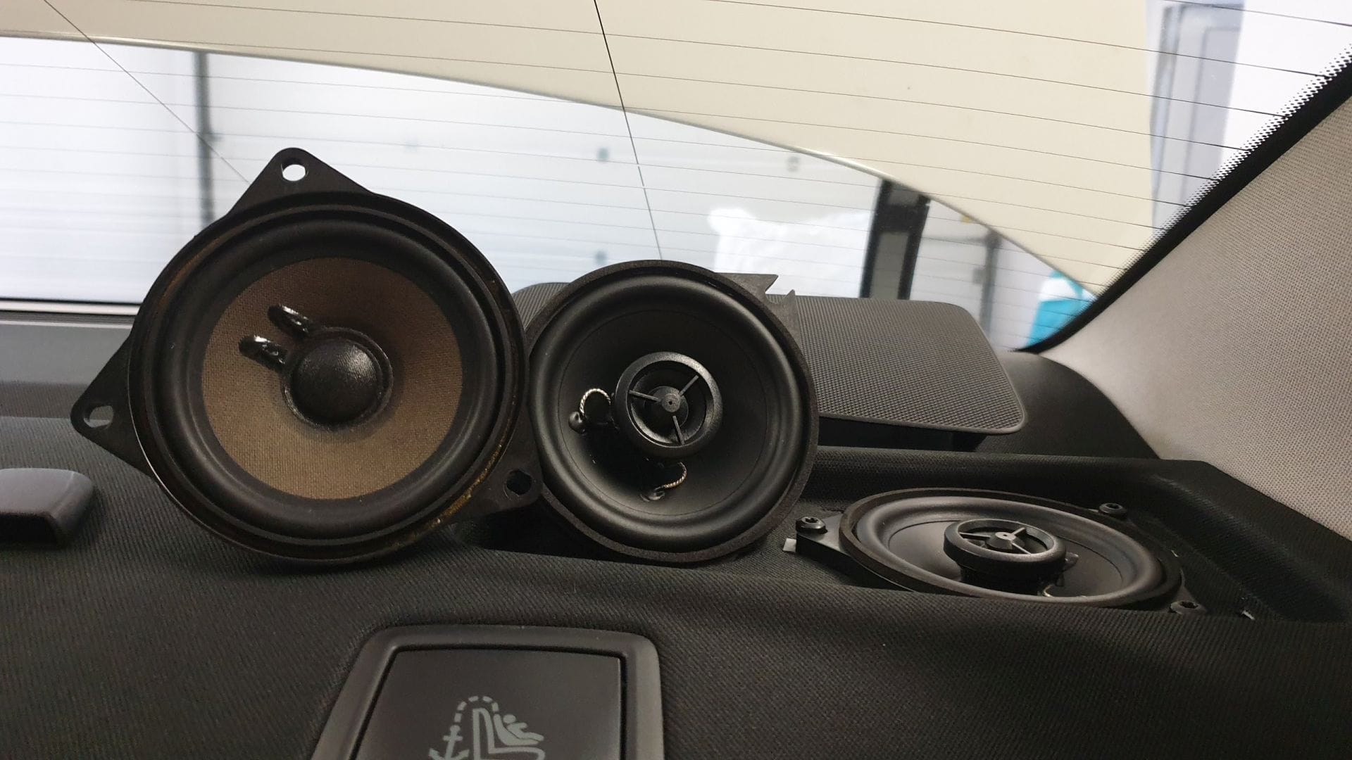 Za maksimalen izkoristek DSP ojačevalca smo nadgradili prav vse tovarniške zvočnike: vgrajen je bil sistem z ločenim visokotoncem v sprednjih vratih, koaksialni zvočniki v zadnji polici, nov sredinski zvočnik v armaturi in zmogljiva nizkotonca pod sprednjima sedežema. Vsi zvočniki so vgrajeni na tovarniško predvidenih mestih z uporabo originalnih BMW nadomestnih plastičnih delov.