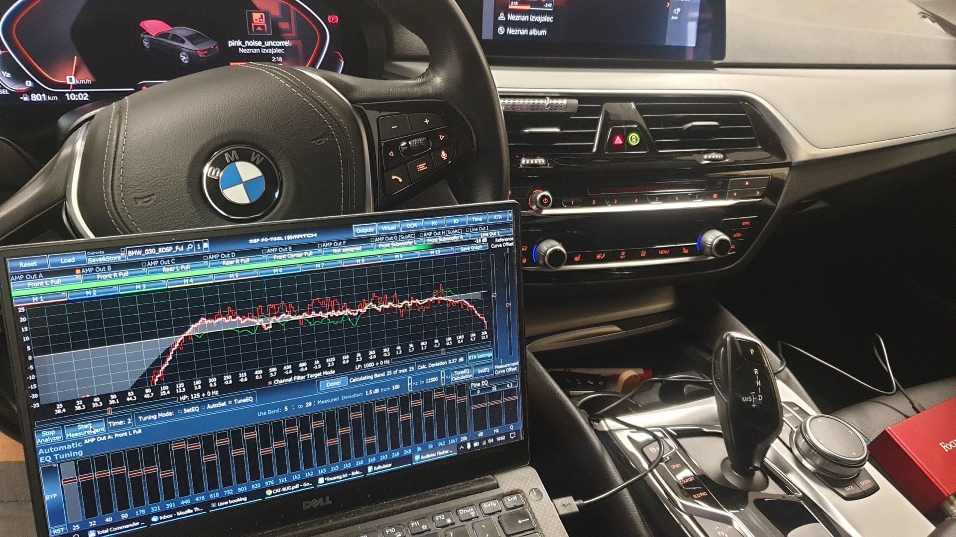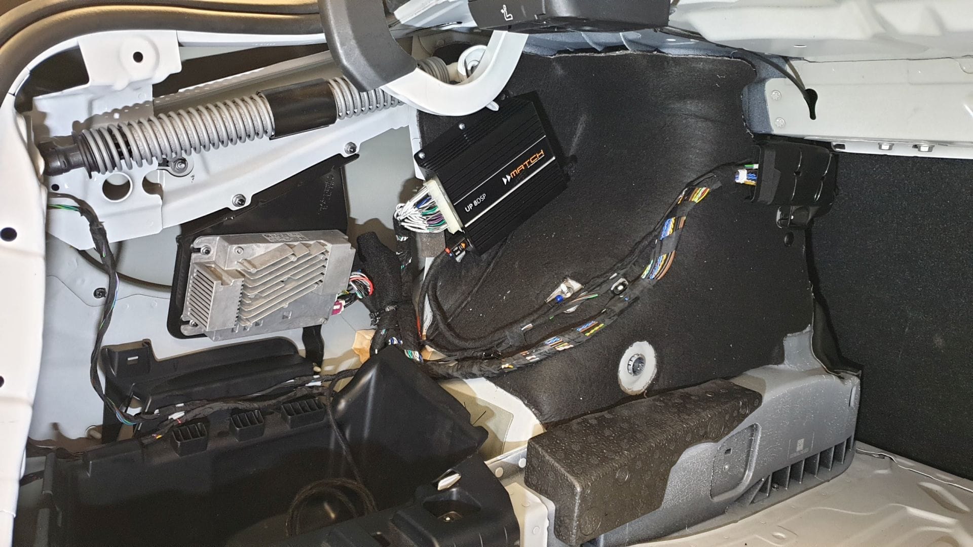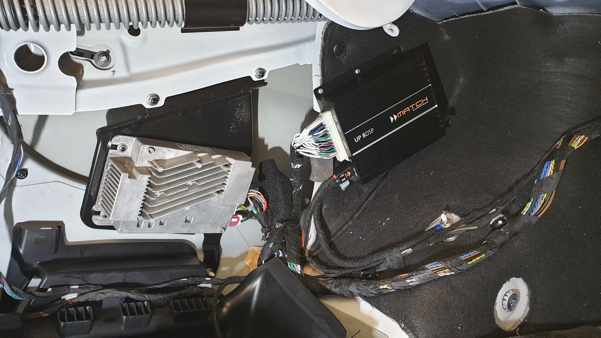 Osnovno ozvočenje v BMW-ju smo nadgradili z vgradnjo 8-kanalnega ojačevalca z vgrajenim DSP zvočnim procesorjem, ki nam omogoča natančno nastavitev delovanja vsakega zvočnika posebej. Ojačevalec priključimo s pomočjo tipskega “Plug’n’Play” kabla, ki omogoča priklop brez poseganja v tovarniško napeljavo.