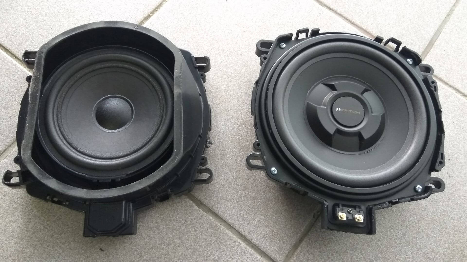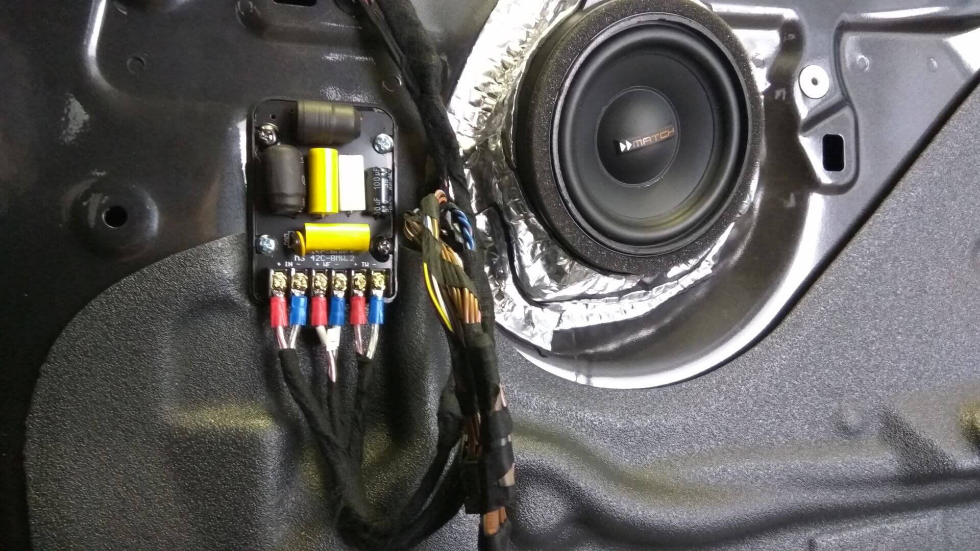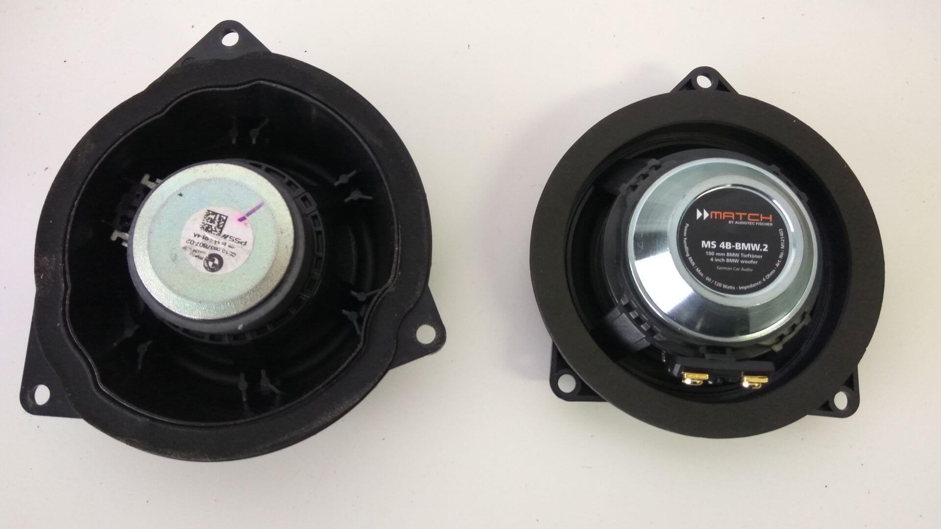 Zamenjali smo tudi vse zvočnike spredaj, torej nizkotonce pod sedeži in 10cm srednje/visokotonce v vratih z odličnim tipskim setom zvočnikov za vozila BMW, Match MS 83C-BMW.2. V prtljažniku smo v dvojno dno vgradili dodaten nizkotonec, ki pa se lahko enostavno odklopi in odstrani s prtljažnika.