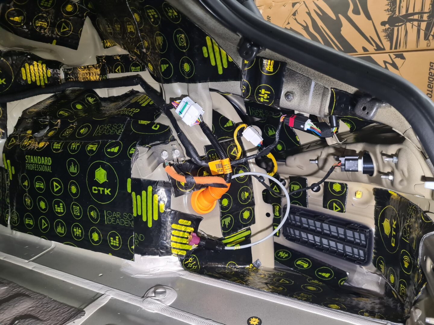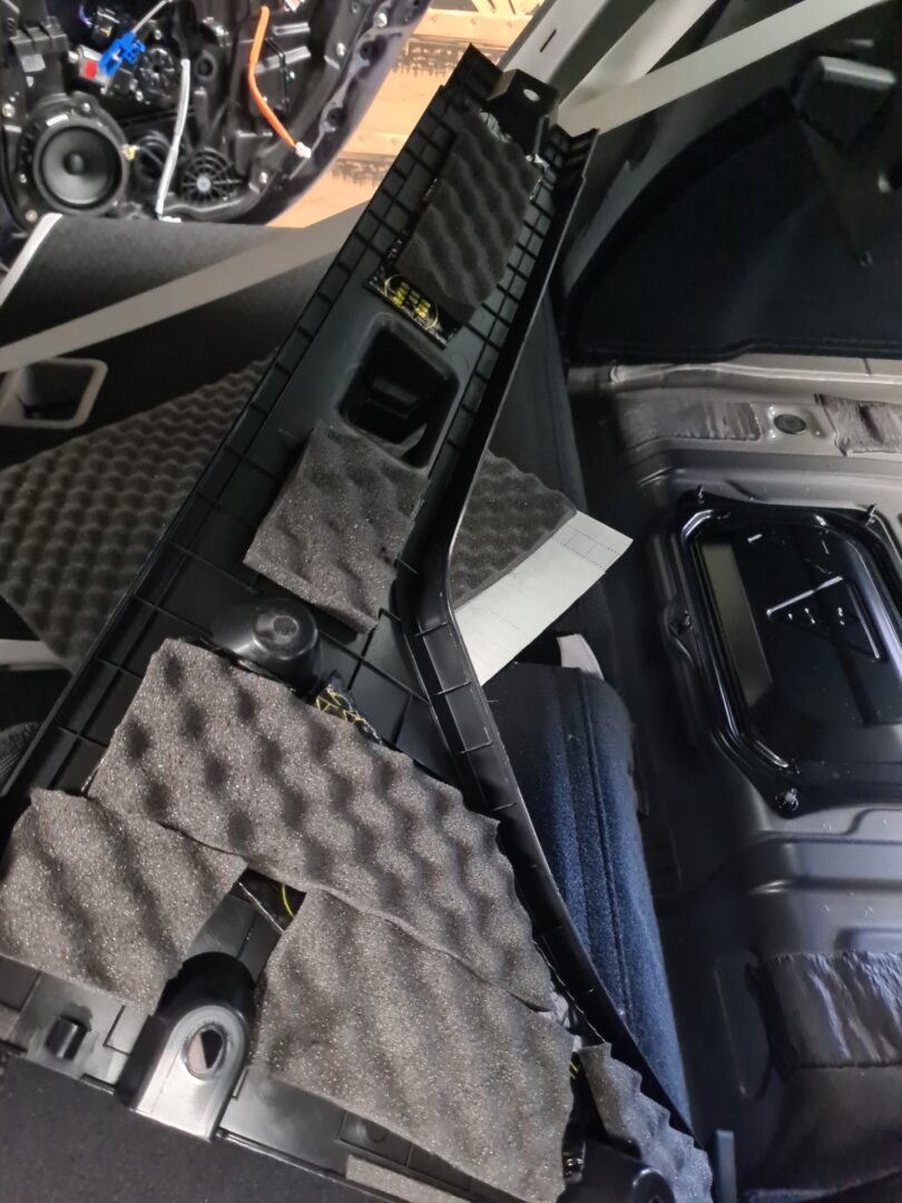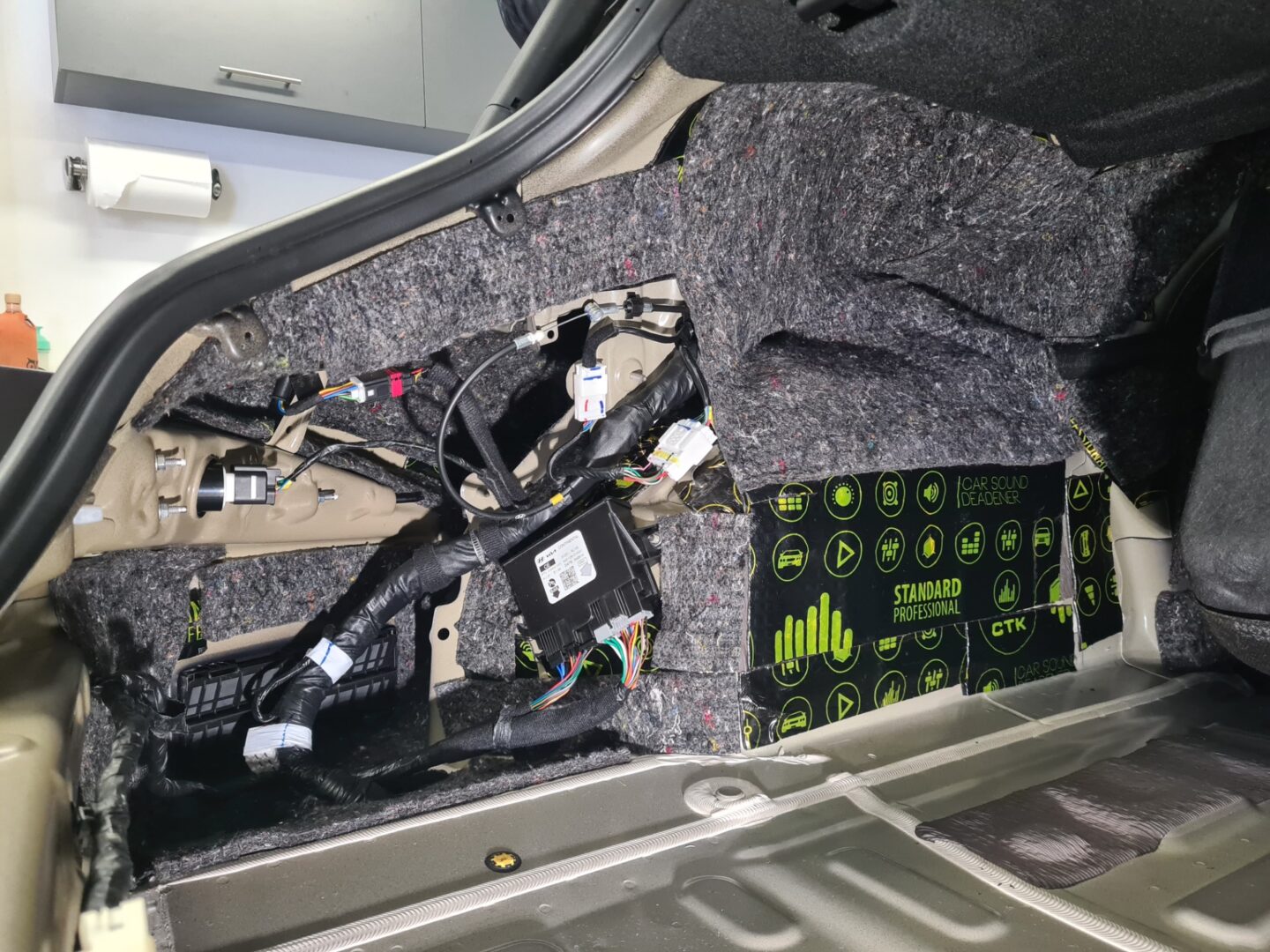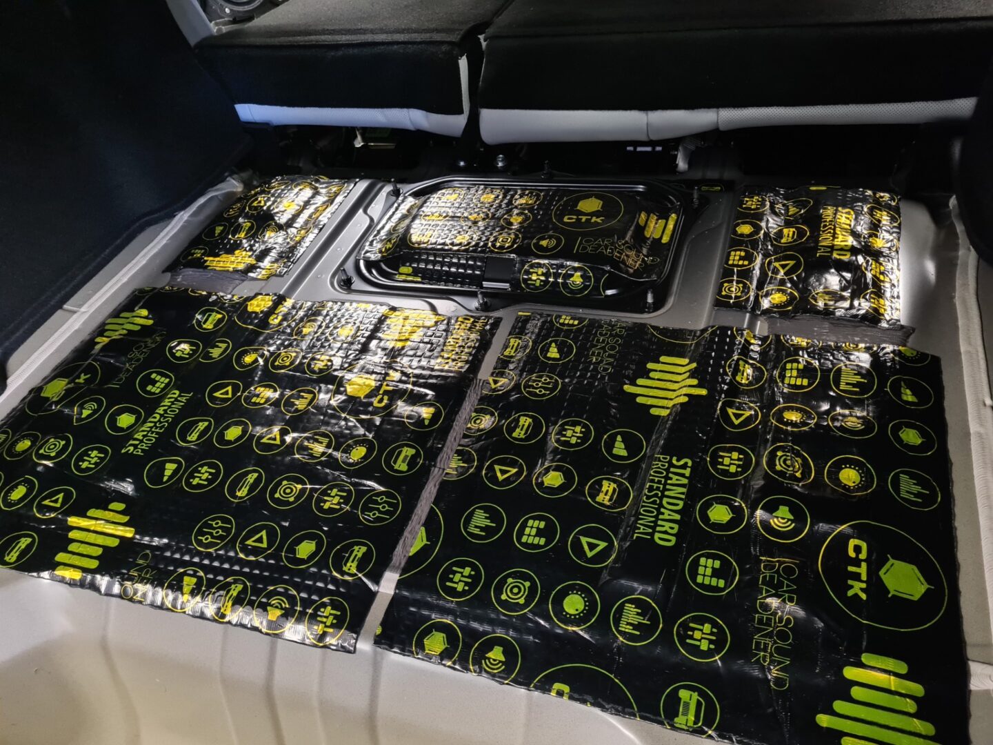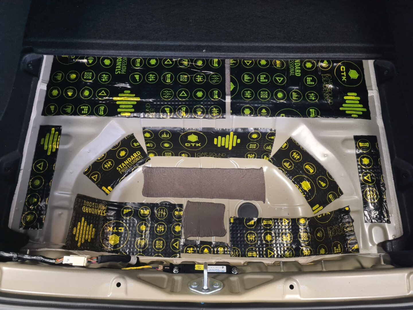Celotno vozilo smo obdelali z večslojnim sistemom zvočne izolacije CTK. Na pločevinaste dele vrat, tal, strehe in prtljažnika smo najprej nanesli vibroizolacijo CTK Standard PRO v dveh debelinah (2 mm in 3 mm), ki učinkovito duši vibracije pločevine in preprečuje resonance. Debelejša 3 mm izvedba je bila nameščena na večje površine, kot so tla in prtljažnik, kjer so vibracije bolj izrazite, tanjša 2 mm izvedba pa na vrata in manjše panele.