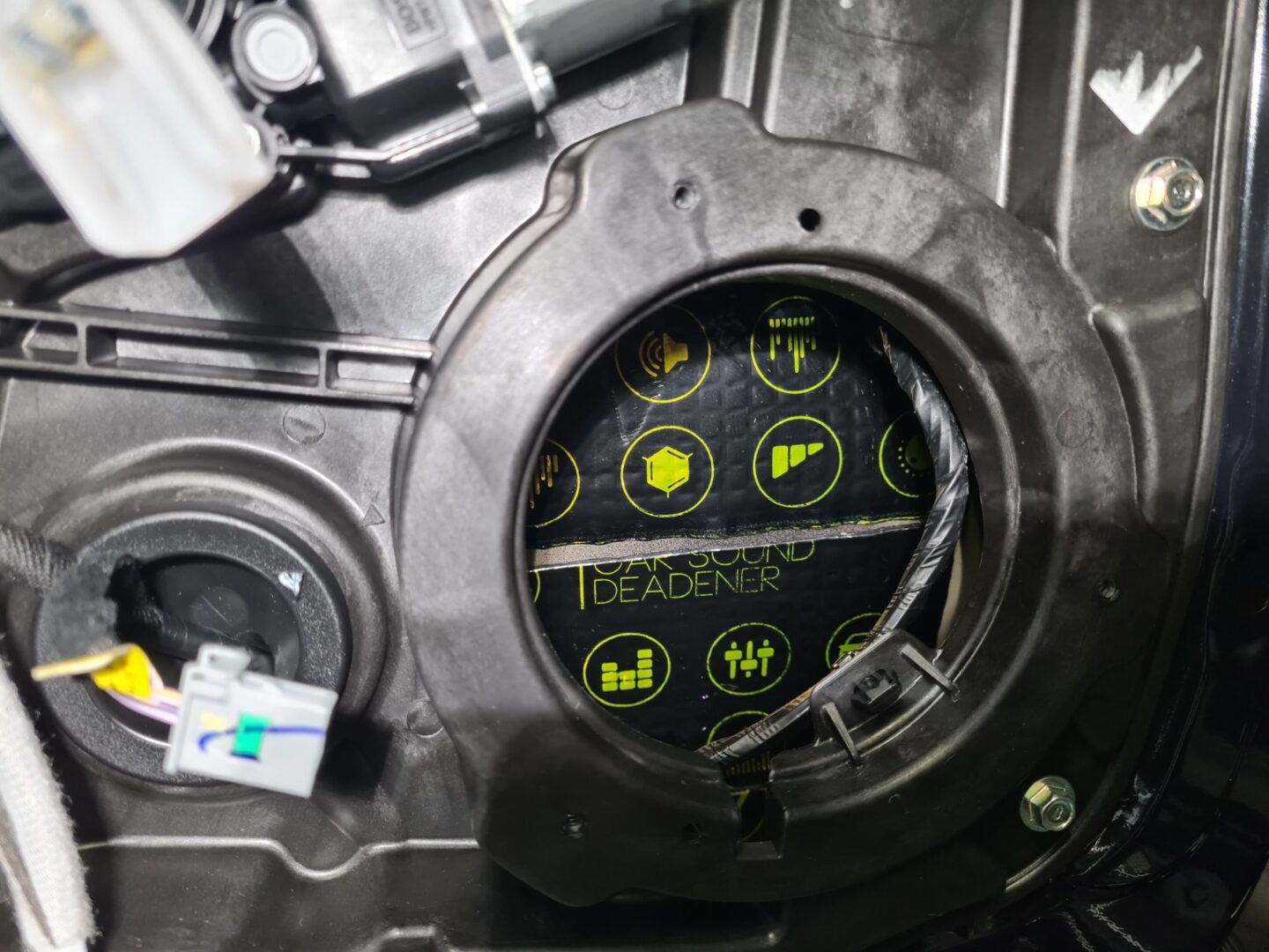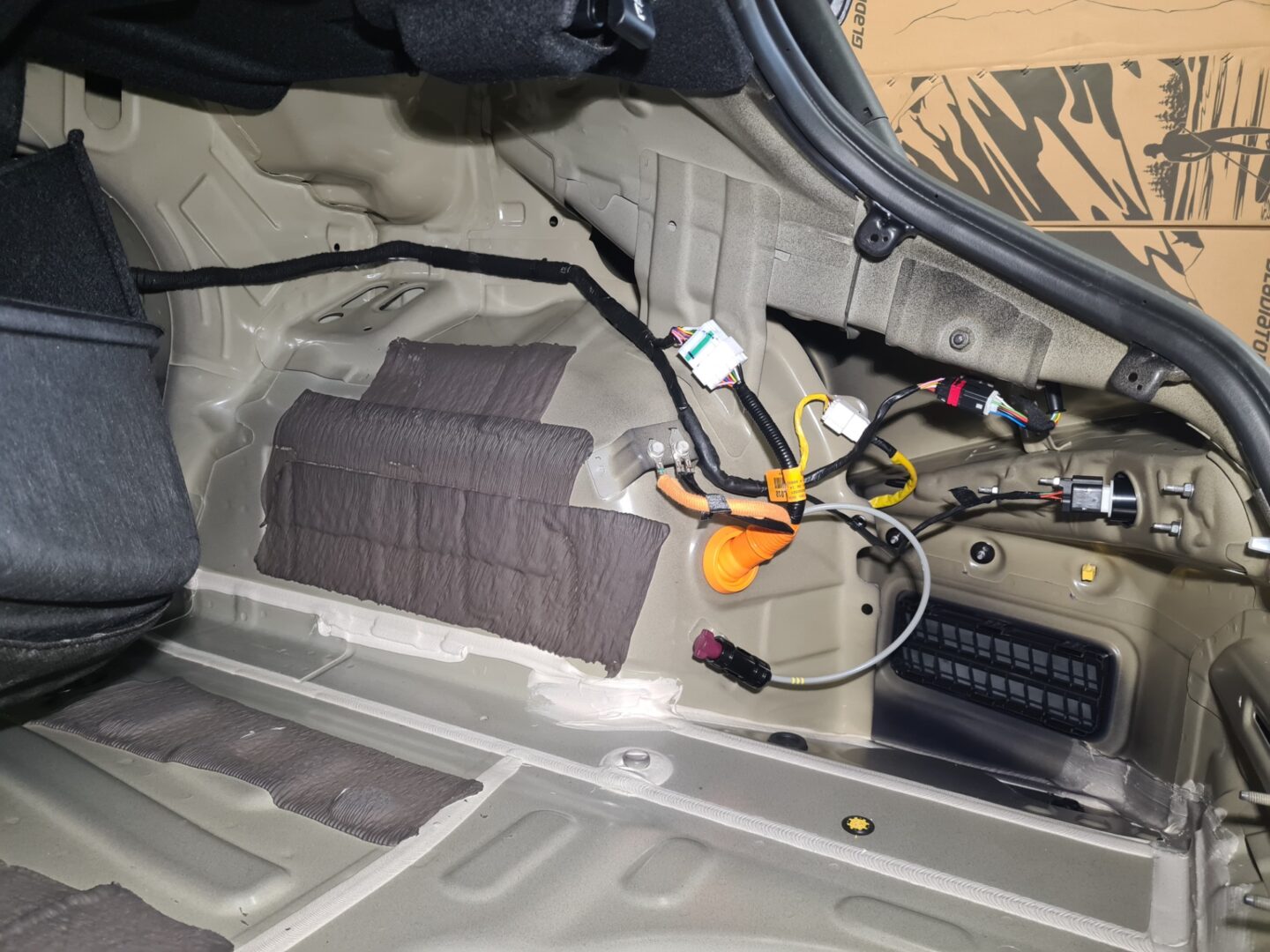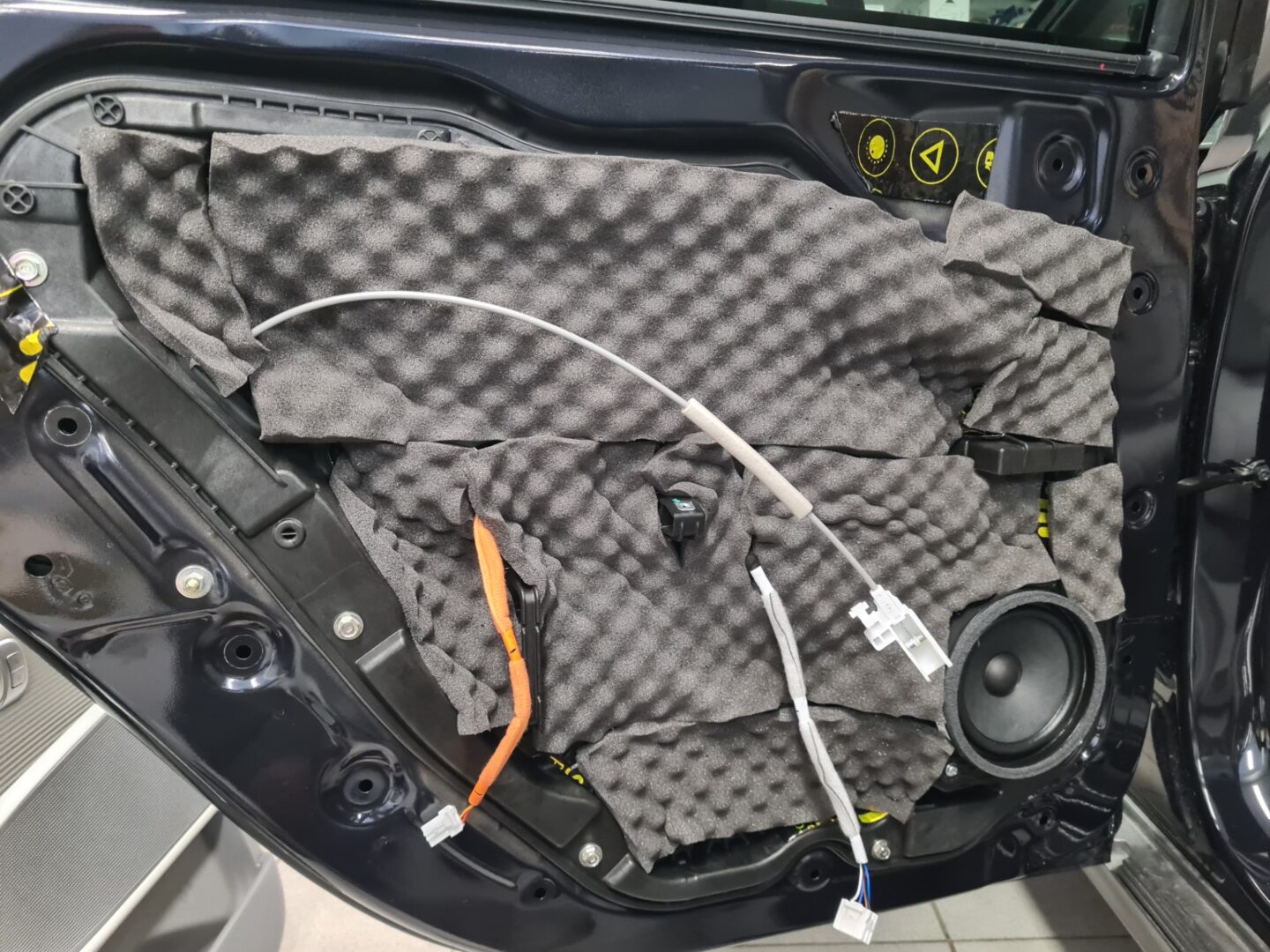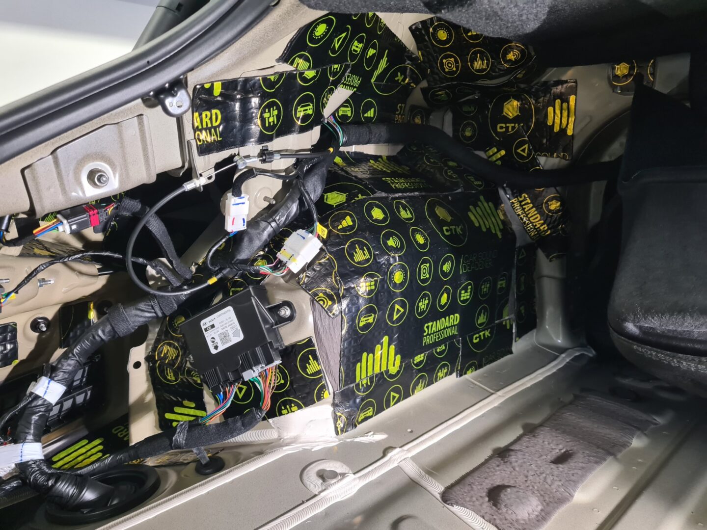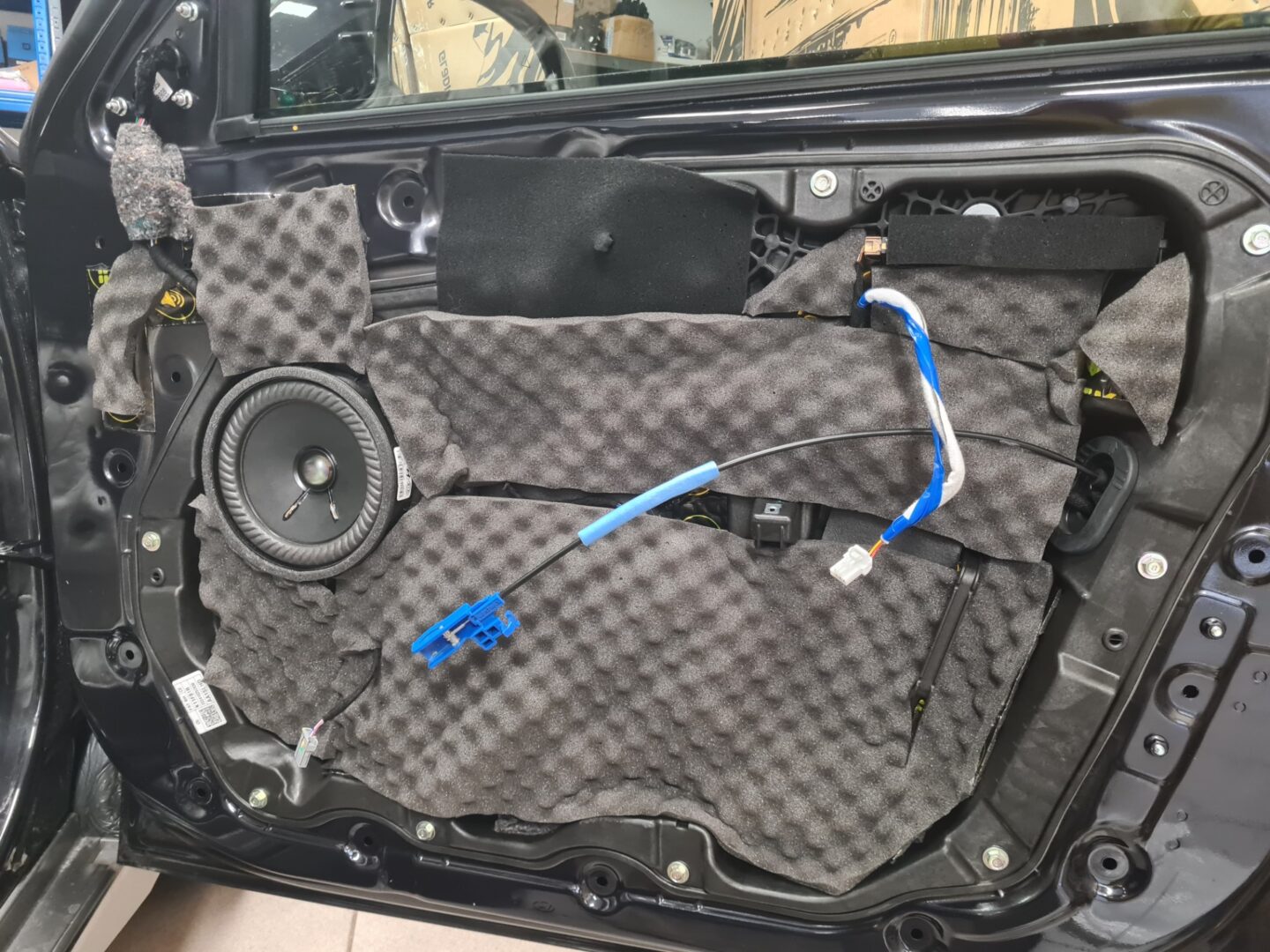 Celotno vozilo smo obdelali z večslojnim sistemom zvočne izolacije CTK. Na pločevinaste dele vrat, tal, strehe in prtljažnika smo najprej nanesli vibroizolacijo CTK Standard PRO v dveh debelinah (2 mm in 3 mm), ki učinkovito duši vibracije pločevine in preprečuje resonance. Debelejša 3 mm izvedba je bila nameščena na večje površine, kot so tla in prtljažnik, kjer so vibracije bolj izrazite, tanjša 2 mm izvedba pa na vrata in manjše panele.