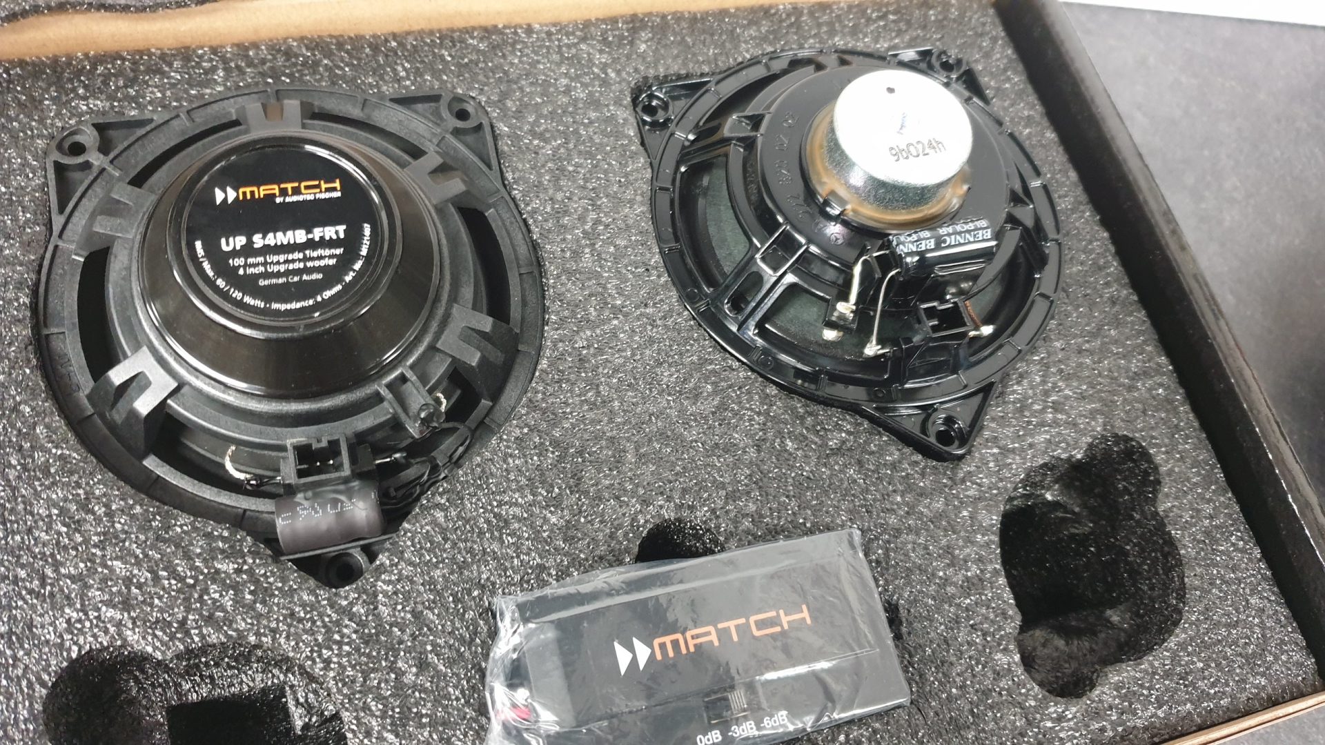 Najprej smo namestili 10-centimetrski komponentni sistem Match UP C42MB-FRT, ki je posebej zasnovan za vozila Mercedes-Benz. Ta sistem zagotavlja boljšo natančnost in dinamiko zvoka po celotnem frekvenčnem spektru ter odlično ločljivost visokih tonov zahvaljujoč 25-milimetrski visokotonski enoti s svileno kupolo. Poleg tega je nivo visokotonca nastavljiv v treh stopnjah, kar omogoča prilagoditev zvoka glede na osebne preference poslušalca.
