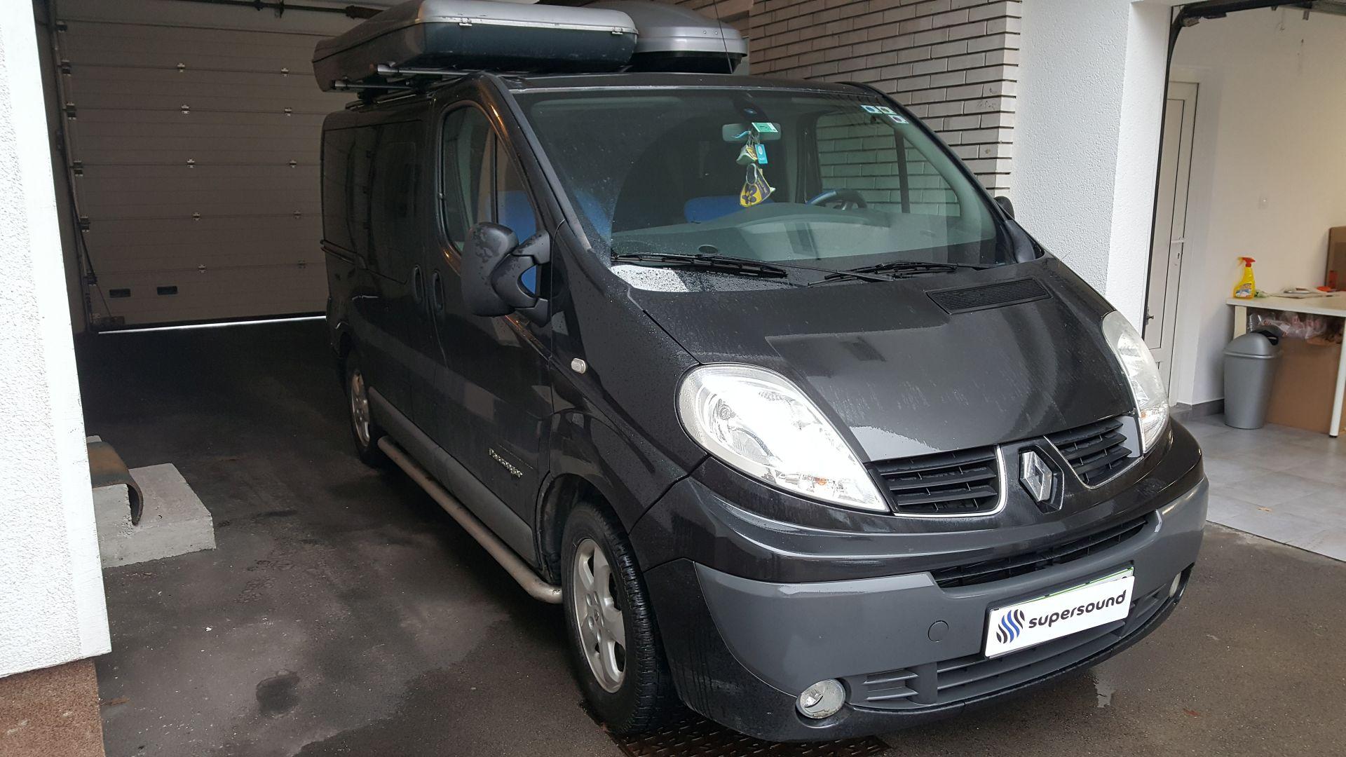 Za zabavo potnikov na zadnjih sedežih smo v Renault Trafic-u vgradili 10.1″ (25.6cm) stropni LCD, ki ima vgrajen lasten multimedijski predvajalnik z USB vhodom. Zvok se lahko z LCD zaslona prenaša na zvočnike v vozilu ali pa se vsebino posluša preko para IR brezžičnih slušalk.